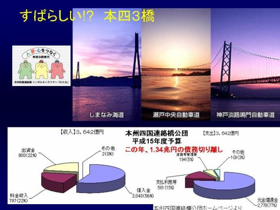 すなわち、本四連絡橋公団ホームページに よると、公団の収入の過半数は借入金であり、 を元金償還と利払いに充てているのです。橋 のメリットを裏付ける料金収入は1/5余りに過 ぎません。