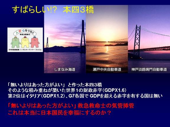 このような無駄の積み重ねが、GDP比1.6倍 と言われる、世界一の財政赤字を招いていま す。救命士の気管挿管や薬剤投与には、その メリットが疑問視される本四2橋と同様の弊 害があるのではないでしょうか。私はMC体 制の整備と早期除細動体制の確立のために、 予算と人員を集中するべき時だと考えていま す。
