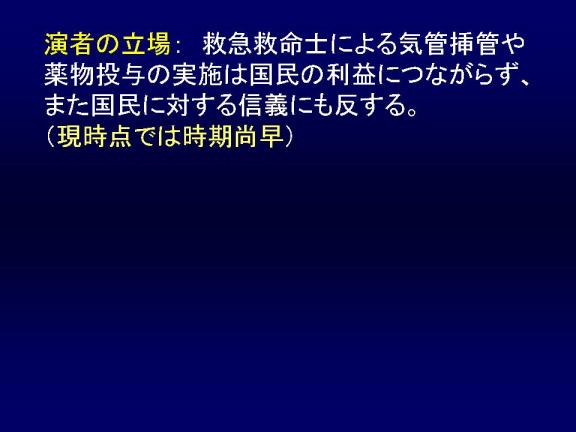私は救命士の気管挿管を本州と四国を結ぶ 架橋事業に例えたいと思います。救命士の包 括的指示下の除細動には救命効果があり、間 違いなく国民に利するものと思います。しか し、救急隊員による気管挿管、薬剤投与につ いては明かな科学的根拠がなく、これらを推 進することは多大な財政負担となった本四架 橋と同様の問題をはらむと考えます。