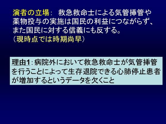 第1に、病院外において救命士が気管挿管 を行うことによって生存退院できる心肺停止 患者が増加するというデータを欠いています。