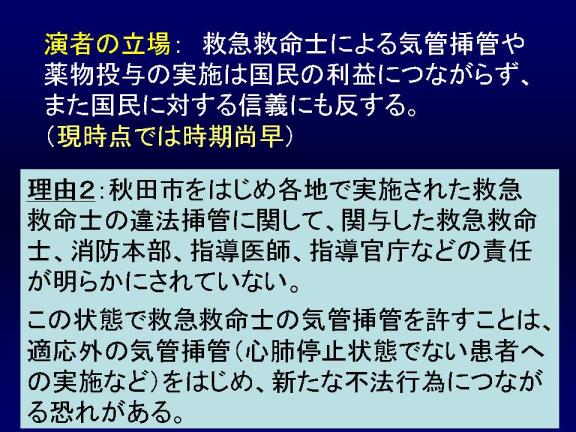 第2に、秋田市をはじめ各地で実施された 救命士の違法挿管に関して、関係者や指導官 庁の責任が明らかにされていません。この状 態で救命士の気管挿管を許すことは、適応外 の気管挿管をはじめ、新たな不法行為につな がる恐れがあります。
