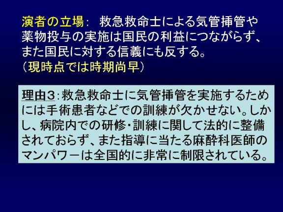 第3に、救命士が気管挿管を実施するため には手術患者などでの訓練が欠かせませんが、 病院内での研修・訓練に関する法的に整備が できていないと思います。また、指導に当た る麻酔科医師のマンパワ−は全国的に非常に 制限されています。