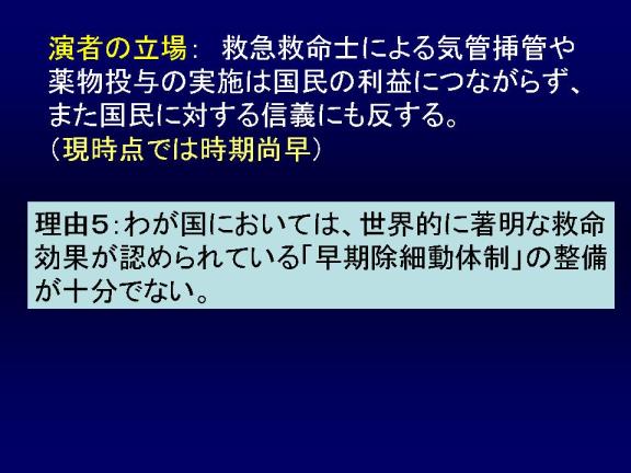 第5に、わが国においては、世界的に著明 な救命効果が認められている「早期除細動体 制」の整備は十分でありません。一般消防職 員や警察官への除細動教育やAEDの全国配備に こそ、経費と教育人員を集中するべき時期だ とい考えます。