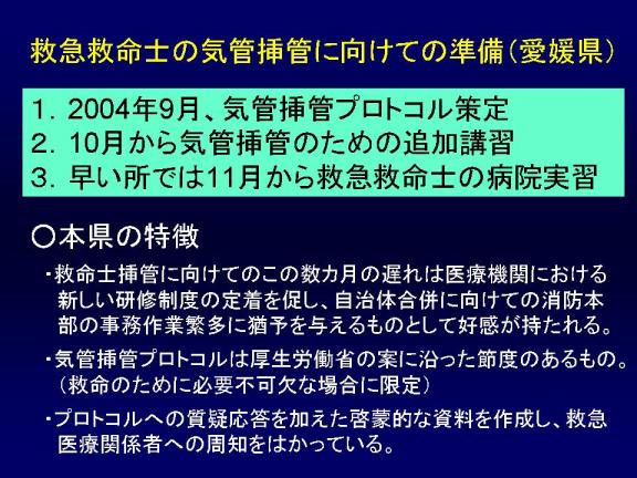 救急救命士(以下、救命士)による気管挿 管に慎重な立場から、愛媛県におけるメディ カルコントロール(以下、MC)の整備と救 命士挿管の準備状況について考察します。