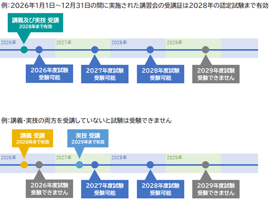 - 認定講習会・地区実技講習の受講証の有効期限は「受講日の翌々年の認定試験まで」です。