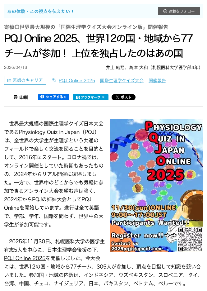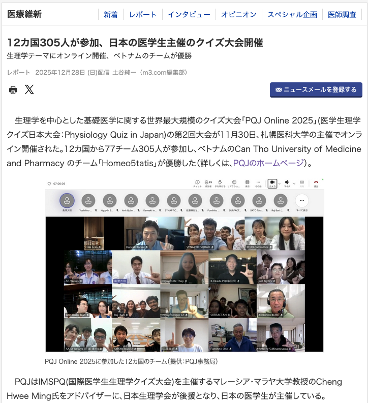 PQJO2025(医学生理学クイズ日本大会オンライン2025)が、メディアで紹介されています。