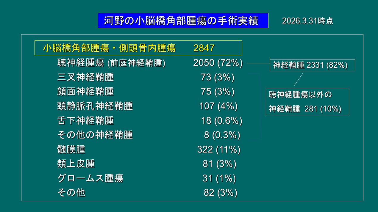 これまでに河野が手術した小脳橋角部腫瘍は2847例、聴神経腫瘍は2050例。