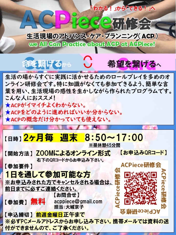 2020年2月22日以降は、 新型コロナウイルス感染症の拡大を鑑み、研修会については、集合型研修ではなく、ZOOMを用いた研修のみを順次、掲載しております。 ACPiece研修にご興味を持っていただきありがとうございます。参加ご希望の方は、【お申し込みはこちら】からお申し込み下さい。尚、携帯メールアドレスからお申し込みされますと、資料などを添付できませんので、必ずPCメールアドレスからお申し込み下さい。