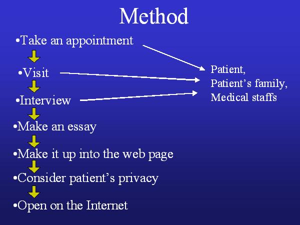 First of all, I needed directly make an appointment with patient, patient's family, and medical staffs. Next, I visited actually and interviewed them. These steps were very bothersome because they were too busy and usually had no e-mail. Next step is I wrote some essays with related episodes and made it up into the web page because I made the web page open on the Internet. I would like to share my precious and troublesome experience with people all over the world.