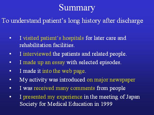 I visited patient's hospitals for later care and rehabilitation facilities. I interviewed the patients and related people. I made up an essay with selected episodes. I made it into the web page. My activity was introduced on major newspaper. I was received many comments from people. I presented my experience in the meeting of Japan Society for Medical Education this year.