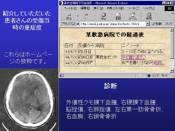 患者さんはあちらこちら、けがをしていましたが、特に脳損傷が重篤でした。最初の病院では30日目に手を握り返すというエピソードがありましたが、40日目に転院しています。