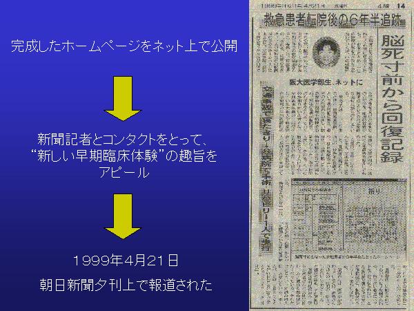 先程のようなホームページをネット上に公開し、その後、新聞記者とコンタクトをとって、“新しい早期臨床体験”の趣旨をアピールしました。そして、今年の4月21日、朝日新聞夕刊上でこのように報道されました。