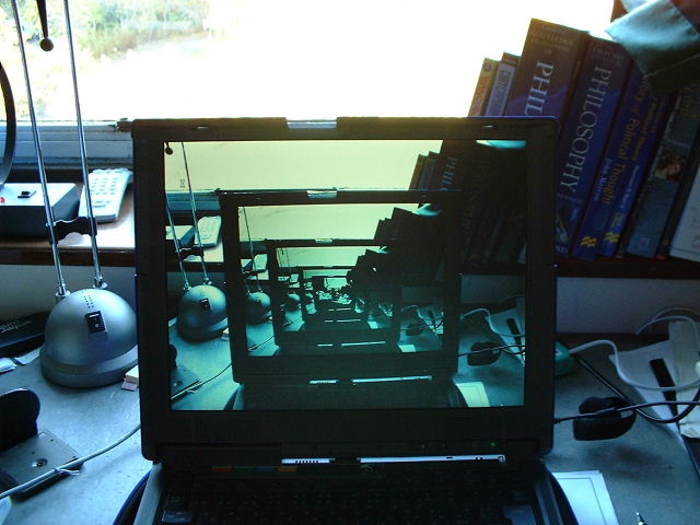 ただ、寮に戻って気付いたのだが、このアダプタはおれの使っている デジカメにも使えることがわかった (というか、もともとデジカメ用のアダプタだった)。 不幸中の幸いと言うべきか。 以下は試しに部屋で撮ってみた写真。 電池を使っているときはあまりこういう無駄な遊びをする気になれない。 [写真: コンピュータの中のコンピュータ、習作]