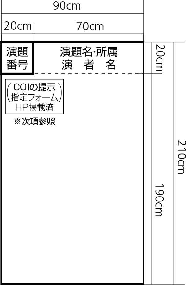 時間を過ぎても撤去されないポスターは運営事務局にて処分いたします。 - 展示パネルの大きさは1題あたり横90cm×縦190cmとなります。 演題番号および掲示用の画鋲は運営事務局にてご用意いたします。演題名・所属演者名の表示は横70cm×縦20cmで各自ご用意ください。