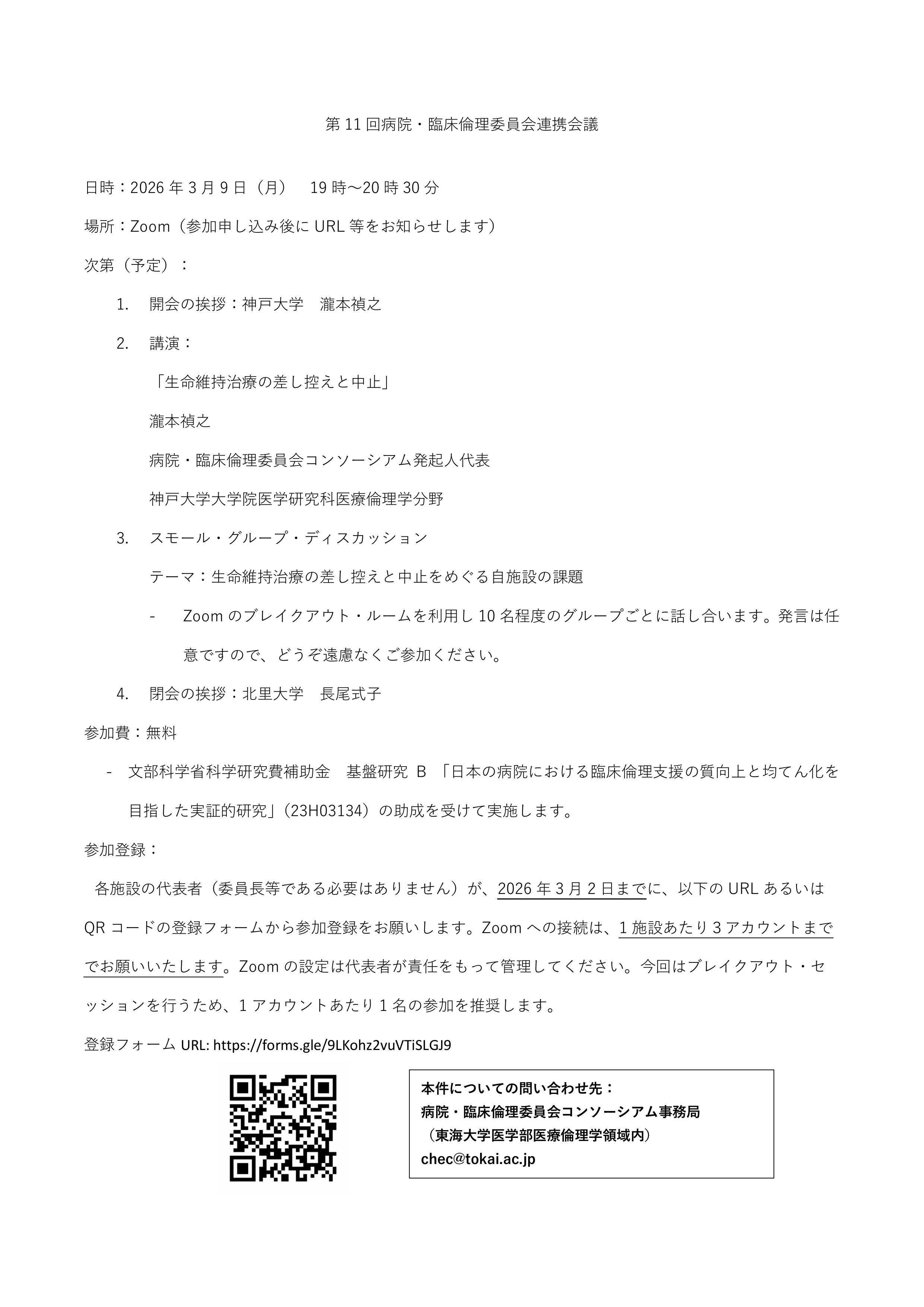 - 第十回 病院・臨床倫理委員会連携会議 開催