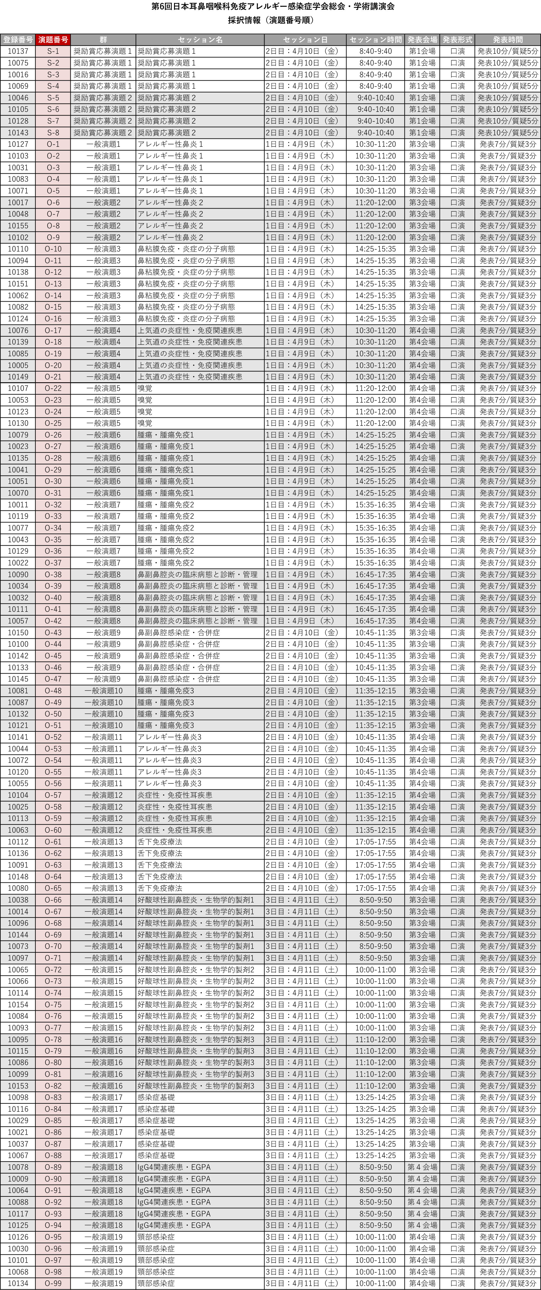 一般演題採択情報:演題番号順一覧