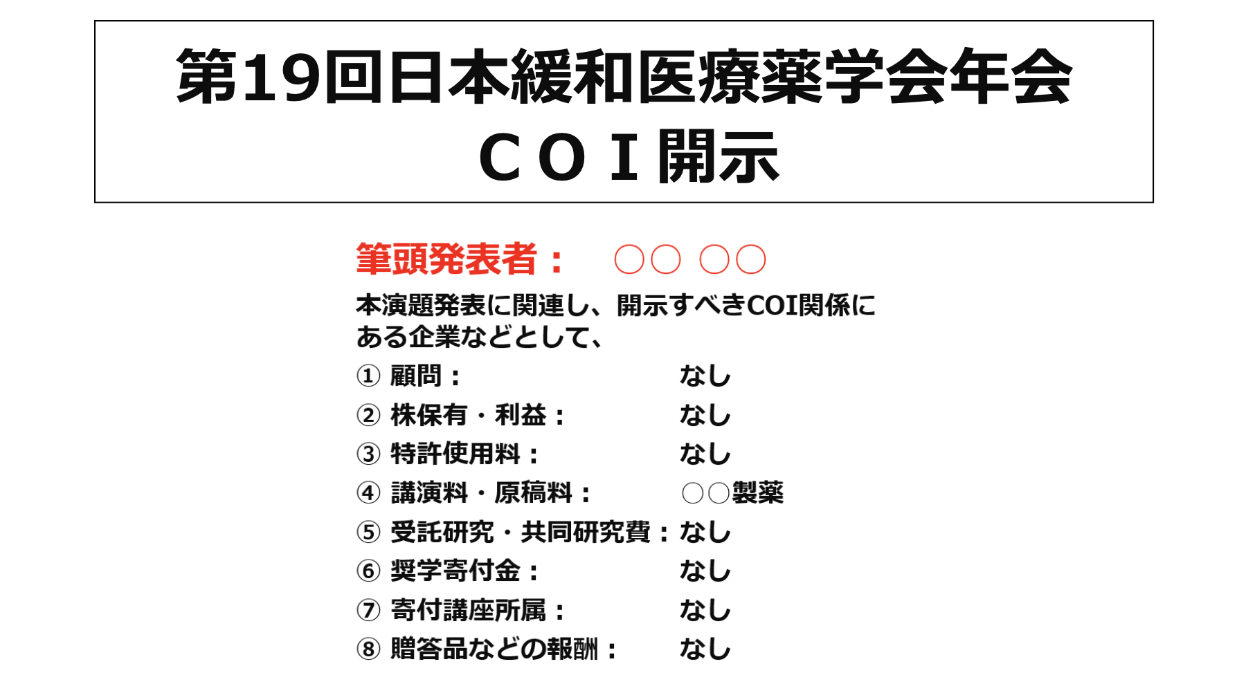 症例報告発表者(複数いる場合は筆頭演者)は、利益相反について報告する必要があります。