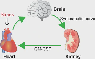 我が国では心不全は増加し続けており、新しい治療法の開発が望まれています。腎臓機能の低下(慢性腎臓病)は心臓病を増やしたり、悪化させます。逆に心臓病は腎臓病を悪化させます。そのため、心臓病と腎臓病がいろいろなメカニズムでお互いに関連し合っていると考えられています(心腎連関)。今回、心臓ー脳ー腎臓をつなぐ新しい臓器の連結機構(ネットワーク)を見いだしました。この臓器ネットワークは、心臓をストレスから守る重要なメカニズムです。実際、このネットワークがうまく働かないようにすると、マウスは心不全を発症するようになります。 心臓を守る臓器ネットワークは、神経と腎臓由来の生理活性分子(コロニー刺激因子2)によってつながっていることを見いだしました。心臓では、免疫細胞の一種であるマクロファージが大事で、心筋細胞の働きを助けるタンパク質アンフィレグリンAmphiregulinを提供して心臓の機能を維持していることを発見しました。アンフィレグリンを働かせなくしたマウスは心不全になりやすく、また心不全を発症したマウスにアンフィレグリンを投与することで心不全を改善させることに成功しました。心臓ー脳ー腎臓をつなぐメカニズムは新しい心不全や慢性腎臓病の治療法の開発へ結びつくことが期待されます。 Fujiu et al. Nat Med 2017