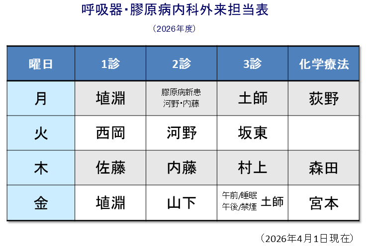 当科では各担当医が広く呼吸器疾患とリウマチ・膠原病疾患を診療するため、一部の特殊外来を除いては、いずれの外来担当医も呼吸器・膠原病外来として診療を行っています。