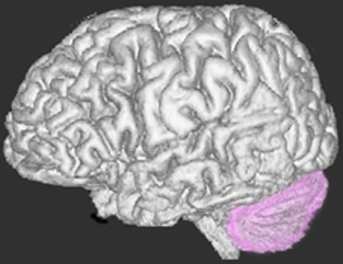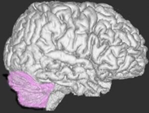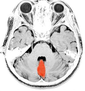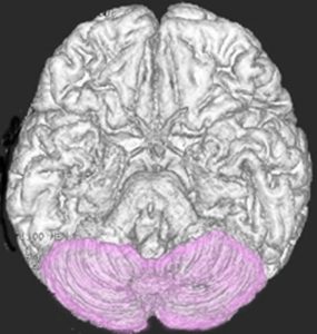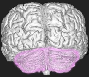 小脳です。両側の小脳半球には主に手足のバランスをとる能力がありますし,表面から見にくいのですが中心部の虫部というところは体の中心線(体幹)の平衡感覚を司っています。小脳が損傷されると小脳失調といってふらつきが出ます。右小脳半球の損傷では右手足の動きがぎこちなくなり,小脳虫部の損傷では体感失調という立っていることが難しくなるという症状が出ます。