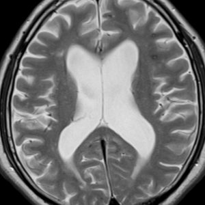 水頭症です,側脳室体部がぷーっと膨らんで,中に髄液が大量にたまっています。