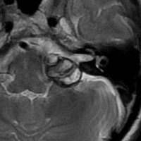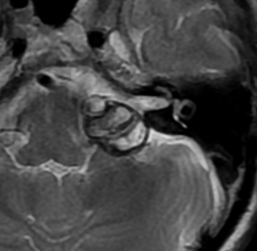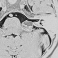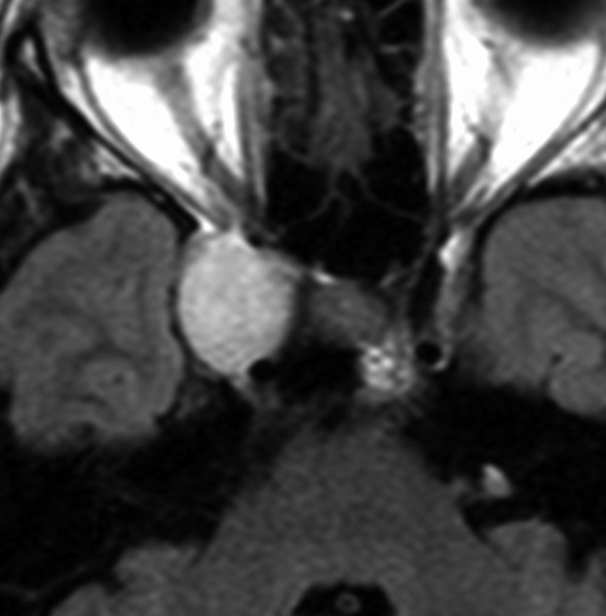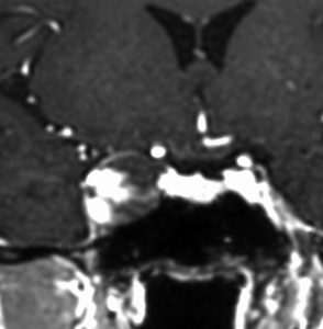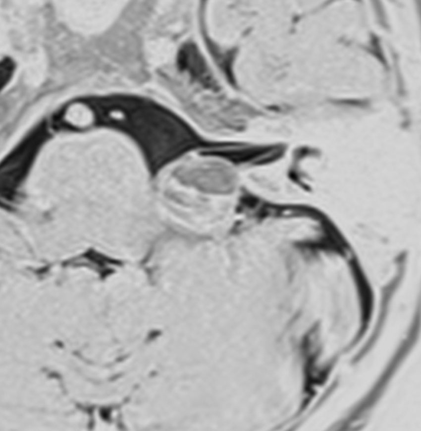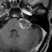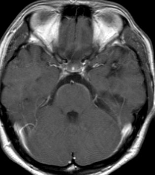 右外転神経麻痺で発症した血管腫です。一見,三叉神経鞘腫のように見えるのですが,ガドリニウム増強のパターンが違います。出血するので面倒ですが全摘出できるものです。