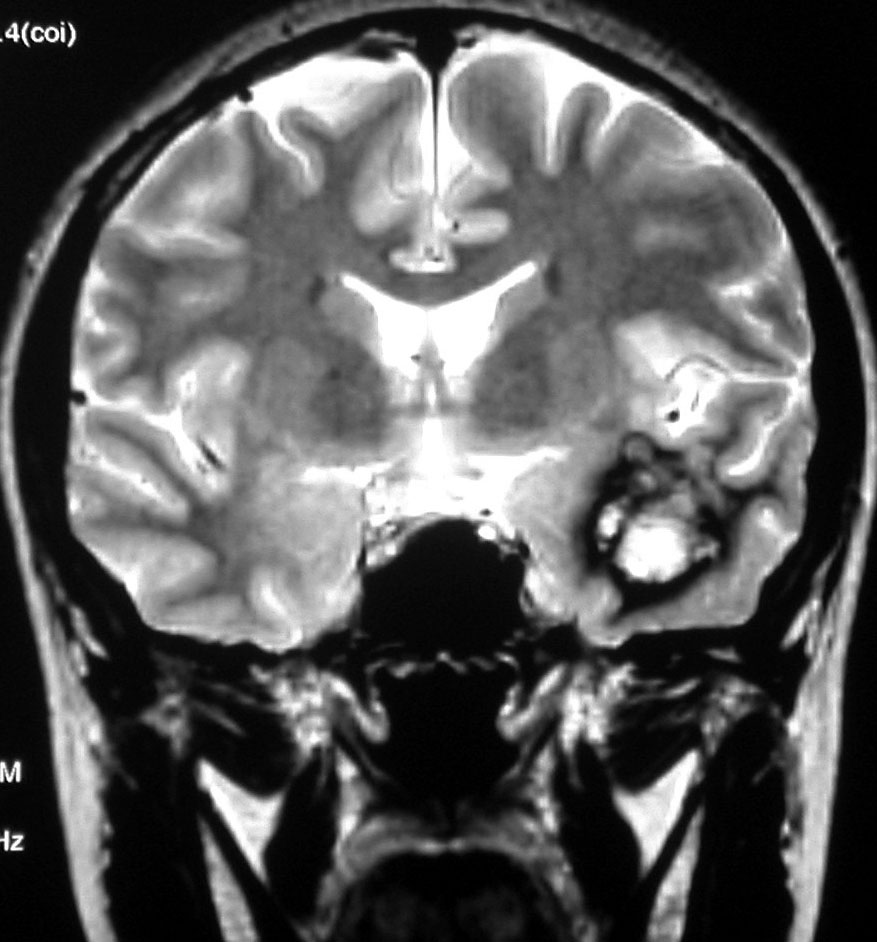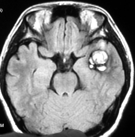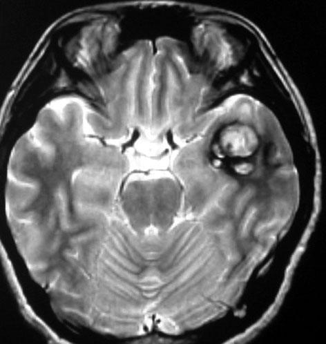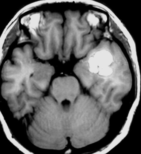 腫瘍から少し出血したために,患者さんはけいれん(てんかん発作)を起こしました。左のT1強調画像では出血を疑います。中央のT2強調画像では海綿状血管腫の周りに脳浮腫があるために白くぼやけた部分があります。右の造影剤を使ったMRIでは造影剤が入るところがほどんど無いことがわかります。側頭葉の海綿状血管腫は側頭葉てんかんという症状で発症することが多いです。