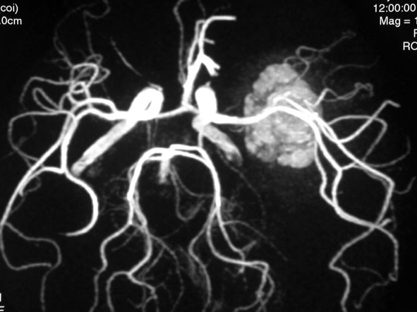 出血したときのMRAです。海綿状血管腫の形がよく見えますが,異常な血管は見えません。