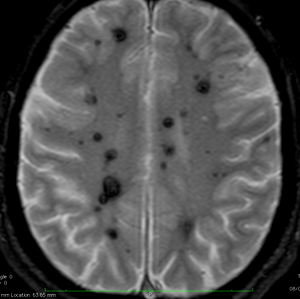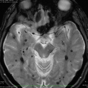 この様な無数の海綿状血管腫を見ることがあります。多くの場合は家族性(遺伝性)の海綿状血管腫です。200個を超える海綿状血管腫があっても普通に何の障害もなく暮らしている患者さんもいます。脊髄の中にも発生しますから,脊髄のMRIもしていただきましょう。