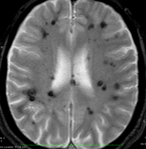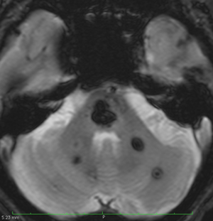 小さな多発性の海綿状血管腫は,T2*(ティーツースター)という左の画像では見えるのですが,右にあるような普通のT1強調画像というのでははっきりみえません。