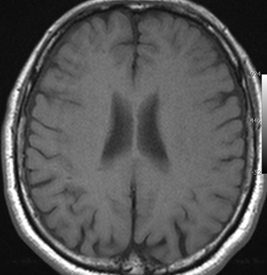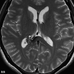 出血が溶けて少し小さくなっています。海綿状血管腫の周りには黒い縁取りがあります。この黒い部分は血液が溶けて残った鉄が脳の中にたまったことを示しています(siderosisといいます)。この鉄のしみ込みはけいれんの原因になると考えられます。この海綿状血管腫は中等度の大きさですが,治療が難しいほどのてんかんが無ければ手術などしないでほっておいてもいいです。手術で側頭葉(特に海馬)を損傷すると記憶の障害などもでます。