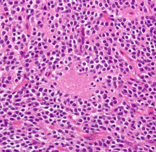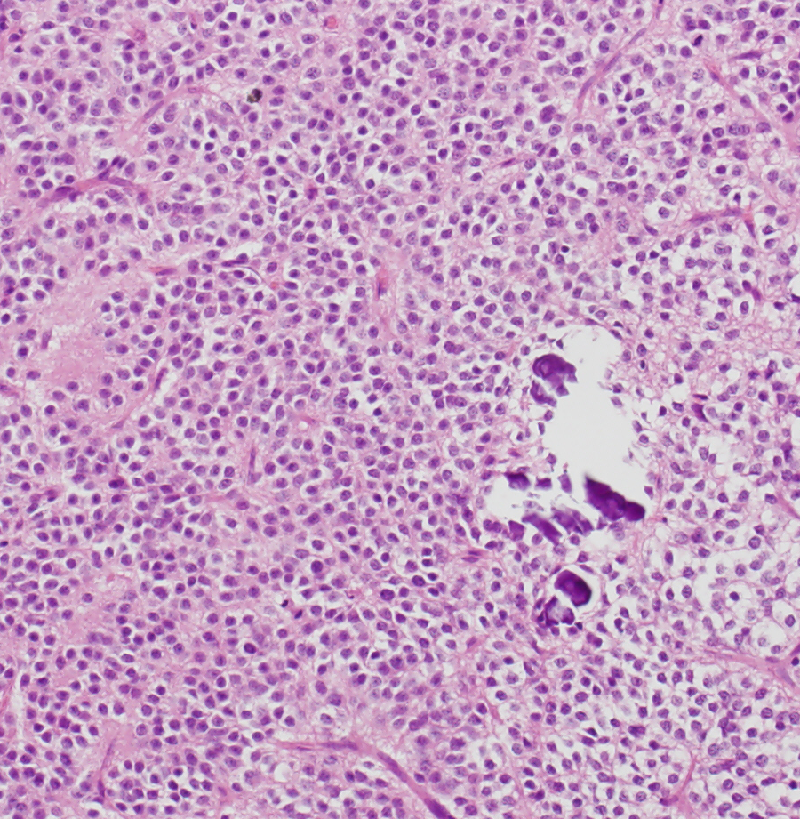 石灰化(画面右側の紫色の部分)とともに、均一な大きさの円形の核を有する腫瘍細胞が敷石状に配列している。