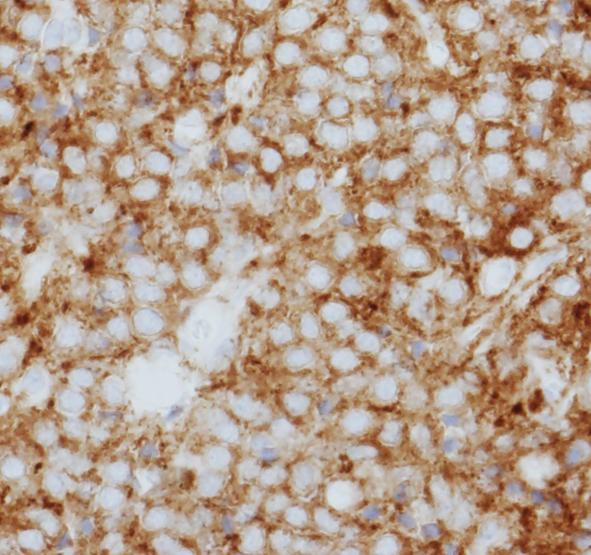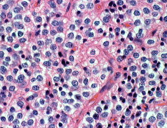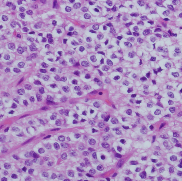 核周囲は明るく抜けている。腫瘍細胞間には細い血管が介在し、腫瘍細胞を区画している。