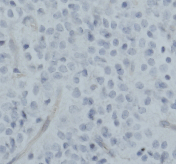 免疫染色(Olig2)。HE染色で核周囲が明るく抜ける形態からoligodendrogliomaが鑑別となるが、Olig2は陰性で、oligodendrogliomaは否定される。