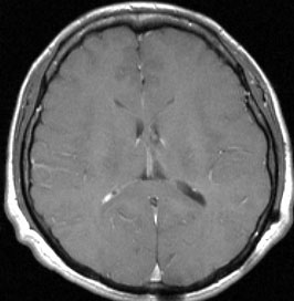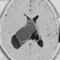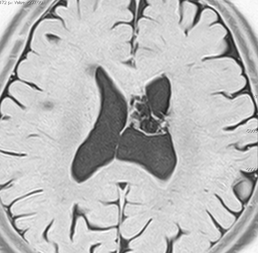 incidental tumor 偶発腫といいます。病理診断はないのですが,まず間違いなくcentral neurocytomaで,数年間の観察で全く増大しませんでした。高齢の患者さんでは無症候で発見し,経過を見ていくと嚢胞変性を来たし,自然退縮していくものも見られす。この例でも,左のモンロー孔は閉塞していて,左側脳室は水頭症となっていますが,無症候です。おそらくこの腫瘍は今後も症候性となることはありません。センロラルニューロサイトーマは,神経鞘腫と同様に加齢によって変性し退縮する自然歴を有している腫瘍です。