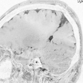 20代の男性の神経細胞腫です。側脳室の中のとても大きな腫瘍です。上段はガドリニウムという造影剤を入れた時のMRIです。下段の中央はCTですが,石灰化が見られます。脳外科の先生には,この脳室内腫瘍は一見transcallosal approach(経脳梁到達法)という手術で取れるように見えるかもしれませんが,そうではなくて,脳室の壁とくに上壁と側壁にくっついているのでなかなか取れません。この患者さんの場合は右の頭頂葉というところからtranscortical approach(経皮質到達法)で全摘出しました。後遺症もなく再発もなく術後10年が過ぎています。全部とれれば治ってしまう腫瘍です。