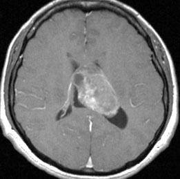 - CTでは石灰化 (50%) がみれますし,MRIではのう胞が見られて(80%) 造影剤で白く増強(全例)されます