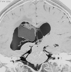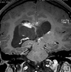 central neurocytomaは腫瘍実質部分が多いものです。しかし,この例のように腫瘍の大部分をのう胞が占める症例もあります。