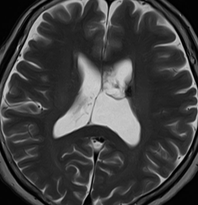 central neurocytomaが透明中隔 septum pellucidum から発生していることがよくわかる症例です。症状はありませんでしたが,この腫瘍がこのままのサイズで留まることはあり得ないので手術摘出を勧めました。これ以上大きくなると手術にしても放射線治療にしてもリスクが大きくなりすぎます。脳弓にくっつくので脳弓損傷を避けるのが手術のポイントです。脳室壁にくっつくのですが剥がしていけば取れますが,大きな上衣下静脈 large subependymal vein の損傷には注意を払います。
