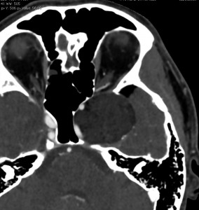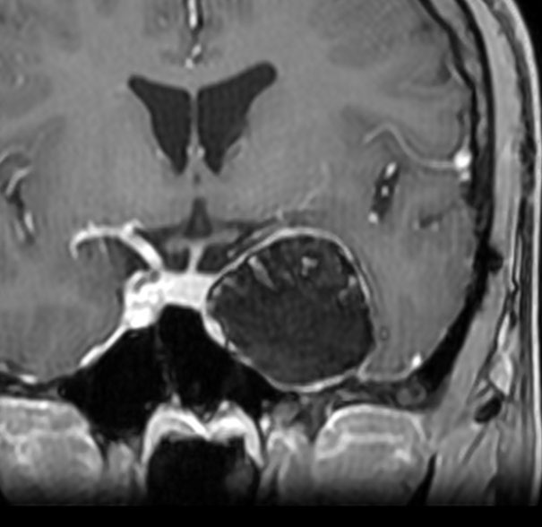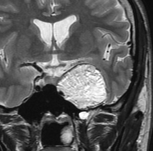 7歳の時に偶然発見された左海綿静脈洞外壁の類皮のう胞 dermoid cystで,多数の脳神経と皮膜が癒着するものです。この腫瘍は先天性の腫瘍なのでおそらく生まれた時からあったものです。10歳の時に手術摘出しました。画像は22歳の時の手術前のものです。何故2回も部分摘出したのかは,この類皮のう胞というのは脳組織や髄膜や脳神経にベトベト癒着してくっつく性質があるからです。海綿静脈洞内にある脳神経と剥離できませんでした。でも初回手術から12年無症状でしたし,2回目の手術後も無症状です。