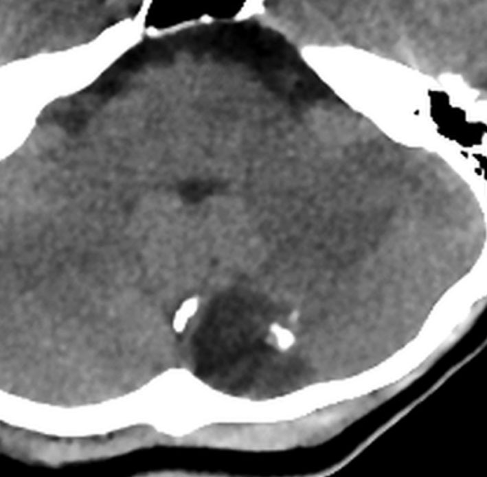 偶然発見された女の子のものです。左のCTで石灰化があります。右の拡散強調画像 DWI で白く高信号に描出されるのが特徴です。手術では腫瘍内部に毛髪がたくさんありました。後下小脳動脈に強く癒着していて,脳軟膜からの剥離もできませんでしたが,完全摘出しました。無症状でも”完全”摘出 complete removal するべきです。