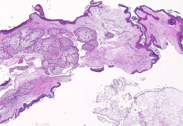 皮脂腺を有する扁平上皮とkeratin material (右下)の概観
