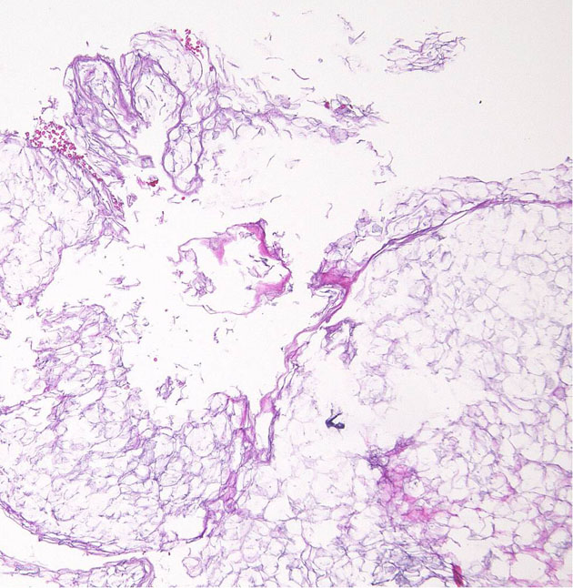• 摘出時の肉眼所見で最も特徴的なのは,黒髪あるいは白髪がのう胞内容の脂肪組織の中に見られることです