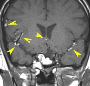 頭痛と嘔吐という髄膜刺激症状で発症しました。鞍結節部の類皮のう胞が破れたものです。黄色い矢印の先の白い点々にみえるのが散らばった内容物です。油滴です。