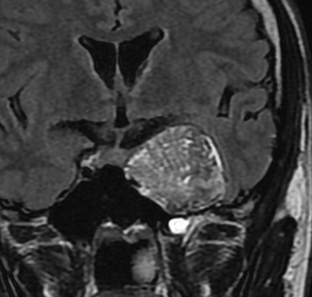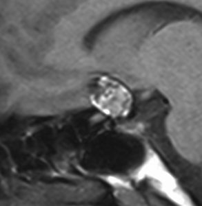 蝶形骨平面から鞍結節上に発生するもので多いタイプです。左側のT2強調画像で内容物がまだらに見え,右側の拡散強調画像で高信号(白い)に見えるので診断確定です。内頸動脈や前大脳動脈や穿通枝などとの癒着が強いものが多いので剥離は難しく要注意です。ある程度の大きさを超えると経鼻内視鏡手術では摘出できません。この腫瘍は脳槽内にあるので,一回の手術でのう胞の壁も含めて全部摘出しなければなりません。そうしないと,手術後に内容物(皮脂と汗とケラチン)が髄液の中に産生されて漏れ出て,難治性の水頭症になります。