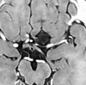 左側の画像はガドリニウム増強のT1強調MRIです。壁が厚いと造影剤で増強されることがありますが,この壁はとて硬いです。