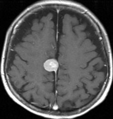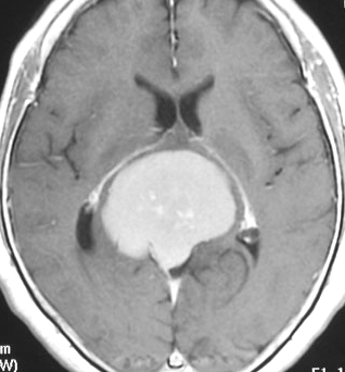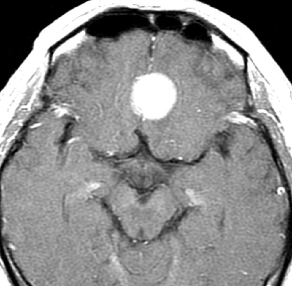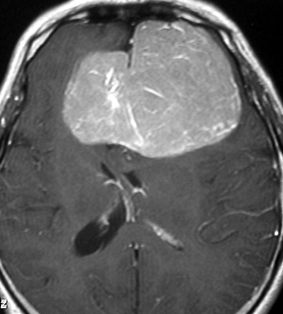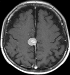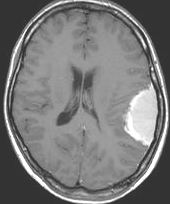 - ガドリニウム造影剤で,髄膜腫がはっきりみえます(コントラストがついて白く見えます)