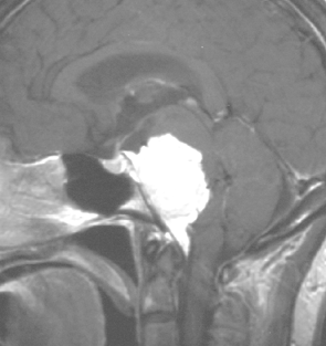 このような髄膜腫は放射線治療にも抵抗性で,摘出と放射線外科治療を何度もなんども繰り返している内に制御がきかなくなります。