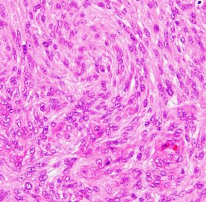 病理像です。左側は初発時のグレード2の髄膜腫。右側は遠隔転移をするようになった頃のものです。グレード2という病理診断でしたが,ほぼグレード3です。核異型性が高く,分裂像が散見され壊死を伴います。MIB-1標識率は25%に達しました。肉腫ともいえるものです。