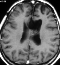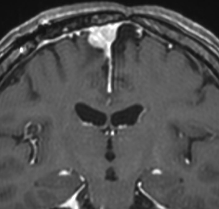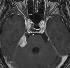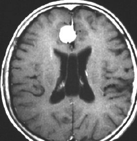 5歳の時に白血病,化学療法と低線量頭蓋照射で治りました。ちゃんと就職して重機の運転をしていましたが,30歳,左足の痙攣で発症しました。多発性髄膜腫が発生していました。摘出する必要があるものです。グレード1の良性の髄膜腫です。